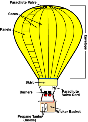 The envelope the basket and the burners. By heating the air inside the balloon with the burner it becomes lighter than the cooler air on the outside. A lot of the.